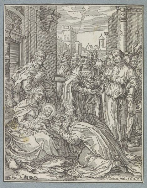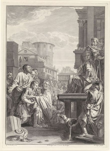 Giovanni Antonio Faldoni created this print, "Priester Alexander Sauli deelt brood uit op Corsica," using etching techniques that demonstrate a masterful control of line and composition. The scene is meticulously organized, dividing the space into distinct zones of action and reception. Notice how Faldoni uses architectural elements—arches, stairways, and a domed structure—to frame and compartmentalize the distribution of bread. These structures not only define space but also suggest a hierarchy, with the clergy positioned against a backdrop of classical grandeur. In contrast, the poor are depicted with stark realism, their destitution evident in their posture and garments. This contrast serves to emphasize the religious themes of charity and divine grace. The act of distributing bread becomes a symbolic gesture, reinforced by the linear precision of the etching that directs our gaze towards the central figures and their interaction. The overall composition invites viewers to reflect on the complex interplay between material need and spiritual offering.