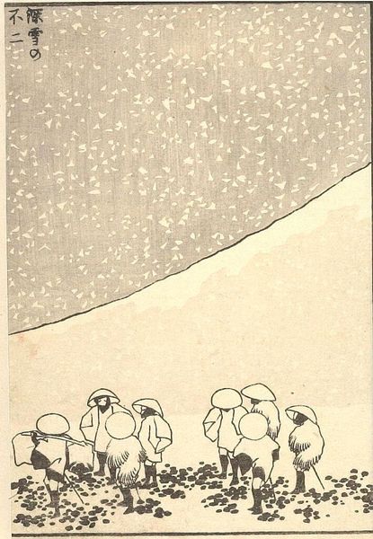 Curator: This striking detached page, residing here at Harvard Art Museums, is titled "Fuji in a Downpour" by Katsushika Hokusai, part of his "One Hundred Views of Mount Fuji." Editor: Whoa, this print feels intense! Like being caught in a sudden storm, all vertical lines and huddled figures. Curator: Hokusai masterfully uses the downpour, depicted by those stark lines, not just as weather but as a visual barrier. The individuals become almost secondary to the overwhelming force of nature. Editor: Absolutely, it's less about the people and more about that feeling of being small against something huge. I wonder if he's saying something about the transience of human life, or maybe the power of nature's resilience. Curator: It's compelling to consider this work within the socio-political climate of Hokusai’s era; the woodblock prints offered accessible art for a broad public, reflecting an interplay between the artist’s vision and the cultural values of the time. Editor: Yeah, it is pretty amazing how this simple image sparks so many feelings, so much connection. Curator: Indeed, it encourages us to consider our place in a larger world, both historically and environmentally. Editor: Totally, I will not complain about rain anymore today!