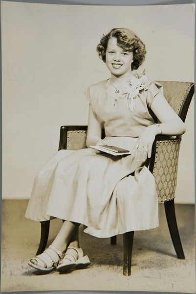 Editor: Here we have Martin Schweig's "Untitled (smiling woman seated in chair)", a black and white photograph from the Harvard Art Museums. It's a portrait, and I'm struck by how posed and formal it feels. What can you tell me about the context of this work? Curator: Considering Schweig's commercial work, this piece might represent a societal expectation of women's presentation. The setting, though seemingly domestic, lacks personalized details, suggesting a staged or idealized environment. What do you think about the way she is presented? Editor: It feels like a constructed image of middle-class respectability, but is it celebrating or critiquing it? Curator: Exactly. Perhaps Schweig, through his lens, is prompting us to question these constructed social roles and the public persona of women. It's not a straightforward representation. Editor: I hadn't considered it that way. It makes me wonder about the expectations of women in photographs during that period. Curator: Precisely, art often reflects and shapes social norms.