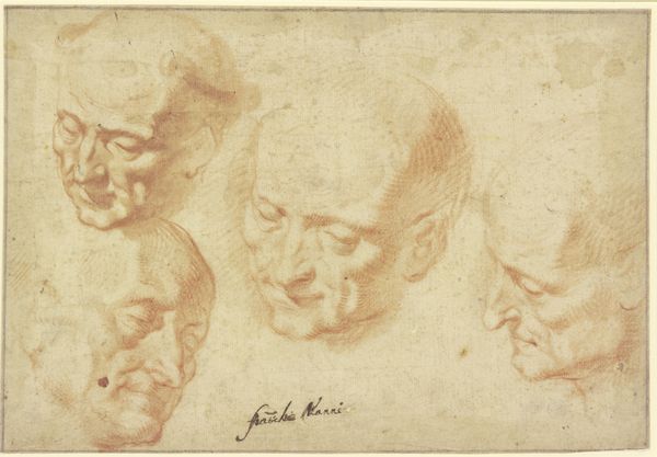 Curator: The initial feeling is almost grotesque; an assembly of faces rendered with such pronounced distortion, it is somewhat unsettling. Editor: We are currently viewing "Five Caricature Heads," a pen and ink drawing dating back to 1490, attributed to Leonardo da Vinci. The work is housed here in the Galleria dell'Accademia, in Florence. Da Vinci has created an undeniably exaggerated portrayal of human physiognomy, and his choices reveal how power dynamics may have influenced this composition. Curator: Absolutely. The line work itself—so precise, so sure—creates this peculiar tension. Each line seems meticulously placed, not just to represent form, but to amplify certain features in a hyper-realistic, yet skewed manner. There's a push and pull between accuracy and deliberate distortion. Editor: These "grotesque heads", as they were sometimes called during the Renaissance, became a fascination among artists, especially those working in courts. They offered an acceptable space to mock, reflect on social types and, sometimes, criticize members of the elite by associating them with those considered to be on the margins of society. Think about how identity becomes weaponized here; through pen and ink, Da Vinci renders these individuals into types. Curator: Right. There's an undeniable violence inherent in caricature. But I think Leonardo uses structure and contrast of shadow and line. These visual techniques serve as methods for exploring psychological dimensions that are not always on the surface of appearances. Editor: Considering this drawing exists within a specific cultural moment – Renaissance Italy, during the rise of humanism and growing social stratifications – what are the power structures influencing representation and spectatorship here? Curator: It really urges me to think about this drawing in our contemporary social media age of filters and distorted reality. Editor: These distorted images are an enduring testament to the power of representation and its ability to reflect, but also shape, our understanding of ourselves and others.