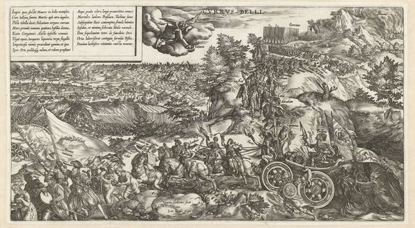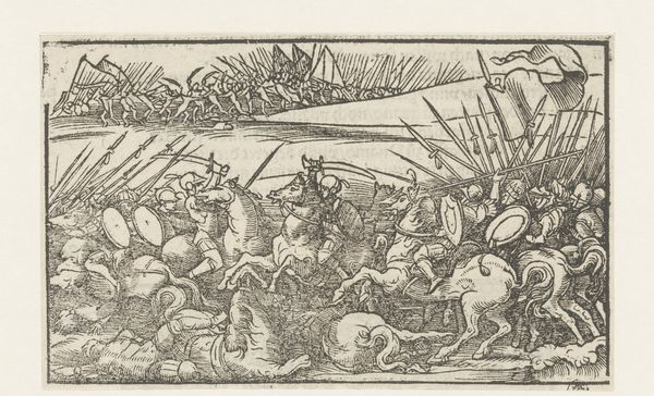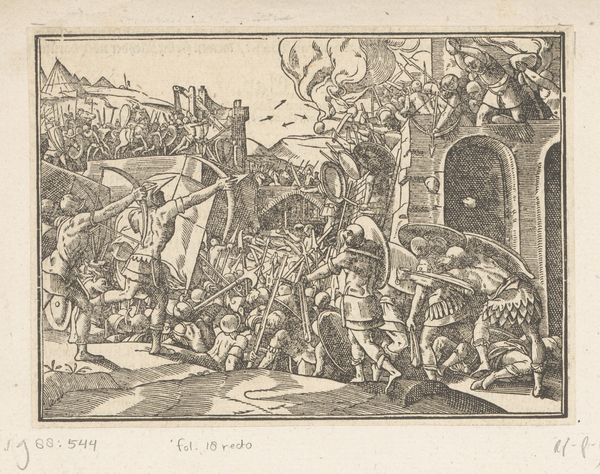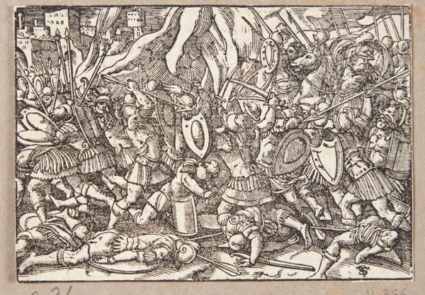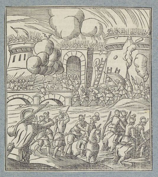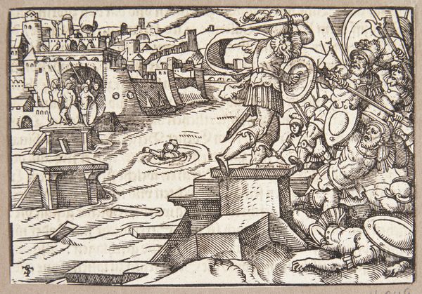 Christoffel van Sichem I made this woodcut, Stadsbestorming, around the turn of the 17th century. Notice how the scene is teeming with figures, each rendered with precise lines. This creates a rich texture, almost a tapestry of violence. The composition divides the scene into distinct foreground and background. In the foreground the chaotic melee of soldiers clashing, while the background shows reinforcements moving towards the besieged city. Sichem uses the formal elements of line and form to structure the narrative. The intricate detailing of armor and weaponry contrasts with the more simplified rendering of the landscape. This directs our attention to the human drama unfolding. The dense arrangement of figures and objects across the image also speaks to a broader cultural interest in detail and order. Sichem’s work invites us to consider the ways in which art reflects and shapes our understanding of conflict, power and societal values.