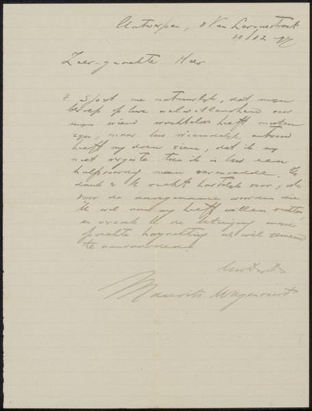 Henri Voordecker produced this letter to Adriaan van der Willigen using ink on paper. The eye is immediately drawn to the contrast between the dark, looping script and the pale surface of the paper. This contrast, along with the vertical orientation and the neat framing of the text within the paper's boundaries, gives the work a formal structure. The handwritten nature of the letter invites us to consider the semiotics of written communication. The strokes and flourishes of the pen create a visual language beyond the semantic content of the words. Each curve and line acts as a signifier, hinting at the personality and intentions of the writer. The placement of the text on the page and the rhythm of the handwriting contribute to its overall meaning. Ultimately, the visual elements invite an examination of the interplay between personal expression and standardized forms. In a world increasingly dominated by printed text, this letter stands as a testament to the unique beauty and communicative power inherent in the art of handwriting.
