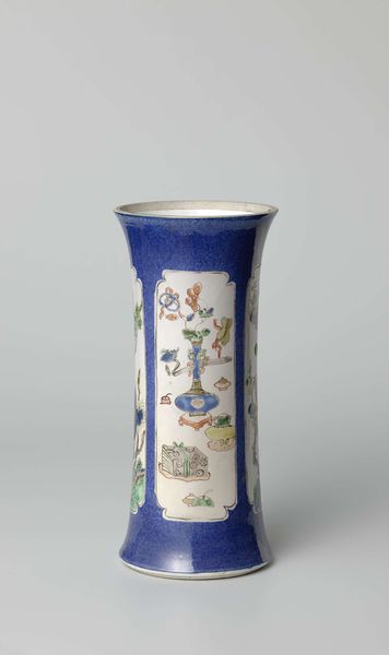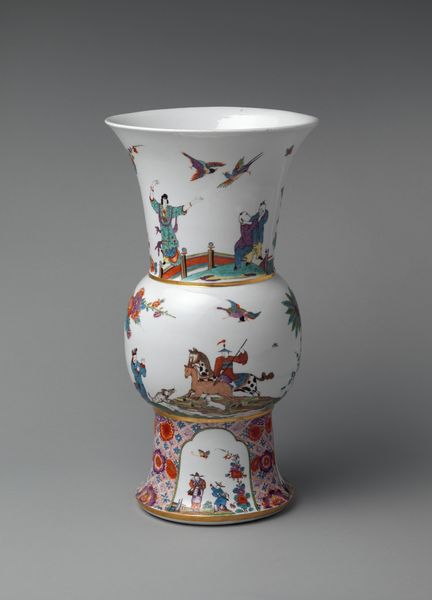 Curator: This is an exquisite example of 19th-century decorative art. The porcelain vase, simply titled "Vase," is currently housed in the Minneapolis Institute of Art. Editor: Ah, its elegance sings! I find its curvaceous form oddly comforting, like a well-fed Renaissance putto ready to burst into song. Is it me, or does it suggest that delicate things can also be quite… substantial? Curator: It's precisely that duality that's compelling. Notice how the dark cobalt blue grounds the frivolity of the gilded rococo flourishes. There’s a visual tension at play, almost a structuralist argument about contrasting form and ornamentation. Editor: I love the menagerie it conjures—those fantastical birds splashed across a dreamy landscape. I want to pluck one out and hold it. Though, I suspect, in this cold universe, their song would sound terribly shrill and breakable. What do you make of it all, the color combination specifically? Curator: I am drawn to the tension arising from the use of polychrome against the ground of deep blue. That shade alone has so many implications, historically and semiotically – think royal Delftware and fine chinoiserie porcelain. Editor: Yes! Speaking of which, the placement of those birds within painted, golden frames reminds me a little of ornate Victorian jewelry displaying painted portrait miniatures. They all seem plucked from some idealized arcadia where only beauty and perfection exist. Curator: It’s not surprising that such art historically evokes these responses; however, the birds in the painting do not only bring beauty, as you pointed out, they contribute to the depth through tonal variation with carefully executed details. The way light reflects across the glassy surface speaks to larger semiotic meanings that go beyond ornamentation to evoke emotions about culture itself. Editor: The whole affair radiates an ethereal grace. It's almost a challenge, this vase, pushing us to imagine another world that transcends our dreary earthly bounds. Curator: Well observed, perhaps we might propose this to encourage the viewer toward aesthetic delight and further art historical reflection, where even common domestic objects embody something much larger. Editor: Exactly! And, sometimes, art’s greatest accomplishment lies simply in transporting us away, even if it is only for a moment.