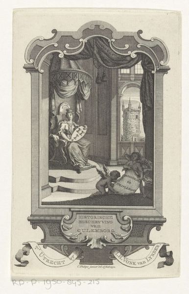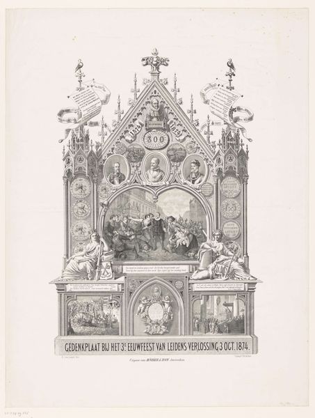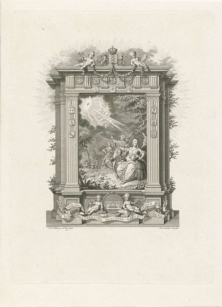 Curator: This engraving, created in 1818 by Pieter Hendrik Jonxis, commemorates the Synod of Dordrecht. Editor: My first impression is one of staged formality. The composition feels meticulously arranged, with a monument presented in a way that seems both grand and rigidly controlled. Curator: Indeed. As a print, made using engraving techniques, this work exists to commemorate a specific historical and political context. The Synod of Dordrecht was a pivotal event for the Dutch Reformed Church, solidifying doctrinal standards. Understanding this context helps decode its symbolism. Editor: The monumentality certainly evokes Neoclassical ideals of order and reason, yet the ethereal figures on clouds feel almost Baroque. How do you interpret these contrasting visual elements? Curator: They reflect a tension between divine authority and human governance. The figures allude to the theological implications, while the architectural monument emphasizes the institutional and social importance of the Synod. It's about the church embedding its own narrative. We also must not forget the historical framework the print was commissioned within, decades after this major assembly took place. It suggests the print operates as propaganda as well. Editor: I see what you mean. The geometric framework also reinforces the idea of an enduring, stable institution. Considering the work through semiotics, we see how its visual language speaks volumes about power and authority. The use of light in the engraving emphasizes this structure, creating stark contrasts between shadow and light that underscore the rigid hierarchy depicted. Curator: And thinking about materiality, engravings are easily reproducible, allowing the image, and therefore the ideas and agenda that the Synod wished to promote to circulate widely among the populace. The deliberate style ensured it appealed to a broad audience, becoming a powerful tool for shaping public memory. Editor: It's interesting how this print, seemingly static in its composition, really offers layers of meaning to dissect. From a formal reading alone, it reveals the intent to establish religious authority. Curator: It leaves us contemplating the role of such prints as cultural artifacts that not only depict events but actively shape their perception and lasting impact on Dutch society.