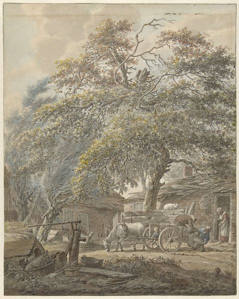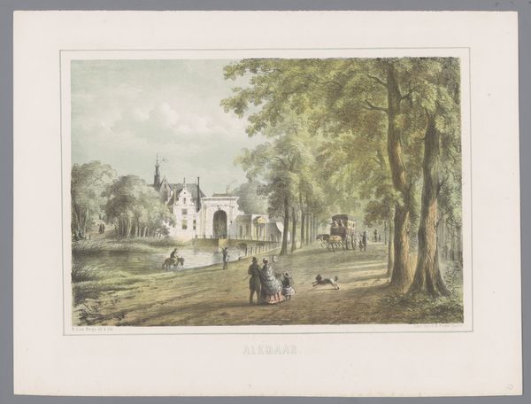 Art Historian: Formalist Editor: This is an interesting print, seemingly untitled, though it is referred to as "Dorpsplein met kinderen rond een kijkkast," placing it sometime between 1850 and 1900. I believe it’s a hand-printed image, though showing its age through the yellowing of the paper. The overall mood is quite charming; children gathered around some form of traveling show, but I am curious as to what draws your attention in this work? Art Historian: What immediately strikes me is the deliberate use of the oval format. How do you perceive this choice impacting the composition? Editor: It seems to isolate the scene, like a captured memory or a glimpse through a spyglass, containing the scene. Does this not serve to emphasize the feeling of a fleeting moment observed? Art Historian: Indeed. And what about the relationship between the figures and their setting? Observe the interplay of light and shadow, the brushstrokes, and how they define the forms. Note the textural contrast between the rough-hewn architecture and the softer, rounded shapes of the figures. Does this offer some interesting lines and form for the eye to follow? Editor: Certainly, the buildings are more rigid, whilst the artist captured the people in curved smooth forms which serve to soften the architecture behind them. Art Historian: Precisely. Consider the placement of each element within the frame. How does the artist manipulate space and form to create depth and balance? Where does your eye go first, and why? Editor: The group of children, mostly as they’re centered but also due to the various pops of colors and detailing in their attire. But also my eye gets carried around the piece, there is not a section in the composition left untouched, even in the upper reaches of the sky the tones capture me, it keeps it enclosed rather than sparse. Art Historian: It is not simply a representation of a village scene, but a carefully constructed arrangement of shapes, tones, and textures that create a unique visual experience. Note how the artist organizes the picture’s surface to reveal underlying principles of harmony and order. A dynamic interplay between the forms, isn't it? What new appreciation has formal analysis opened up for you? Editor: I had not viewed it that way, by diving into the surface qualities you come away with a completely alternative reading and it causes a closer, more intimate viewing of the work. I appreciate this take on the artwork!