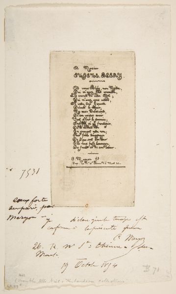 Charles Meryon created this etching "Dedicatory verses by Meryon to Reiner Nooms, called Zeeman" in the 19th century, a period marked by significant social and political upheaval in France. Meryon's choice to dedicate verses to Reiner Nooms, also known as Zeeman, is quite telling. Zeeman was a Dutch Golden Age marine painter. Meryon, who struggled with mental health issues throughout his life, perhaps saw a kindred spirit in Zeeman, another artist who found solace and inspiration in maritime subjects. Meryon's verses express deep admiration and kinship. The act of dedicating verses to another artist also reflects the Romantic era's emphasis on individualism and the artist as a unique, sensitive soul. This work invites us to consider the artist's inner world and the emotional landscape that shaped his artistic vision. It challenges traditional notions of artistic genius, suggesting that vulnerability and empathy can be sources of creative power.