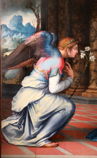 Masolino da Panicale created 'The Archangel Gabriel' using tempera on panel, a common technique of the early Renaissance. The striking richness of the painting comes from the artist's skillful layering of paint, especially visible in the intricate patterns of Gabriel’s robe. Looking closely, you can see the distinct brushstrokes and the way the paint has been built up to create texture. The gold leaf applied to the halo and wings would have been a costly addition, reflecting the value placed on religious imagery at the time. This highlights the economic investment in art, and how wealthy patrons were essential to artistic production. Consider the labor-intensive process of grinding pigments, preparing the panel, and meticulously applying each layer. The materials and their careful application not only give the painting its visual appeal but also root it in a specific historical moment of craft production. This brings us to a richer understanding of the artwork, showing how what might seem like 'just' a painting is actually a combination of skill, labor, and material value.