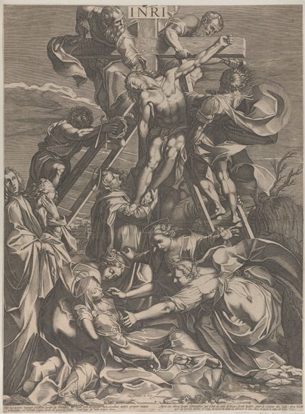 Hendrick Goltzius created the engraving "Hercules and Cacus" in the late 16th century, a period marked by renewed interest in classical mythology. Here, the artist depicts a dynamic and violent confrontation between the hero Hercules and the fire-breathing monster Cacus. Both figures are rendered with exaggerated musculature and their bodies intertwine, filling the frame with tension. Hercules, often celebrated as a symbol of strength, is seen triumphing over Cacus, who represents chaos and barbarism. It is worth considering how Goltzius reflects the anxieties and power dynamics of his own time through this classical story. Representations of masculinity are at play here. Hercules is seen as a heroic figure, and Cacus as a monstrous and terrifying being. The print invites us to consider how these narratives reinforce or challenge contemporary notions of the masculine ideal. Ultimately, "Hercules and Cacus" speaks to the enduring human fascination with tales of heroism, struggle, and the battle between order and chaos. It reminds us of the personal and emotional dimensions of these mythical narratives.