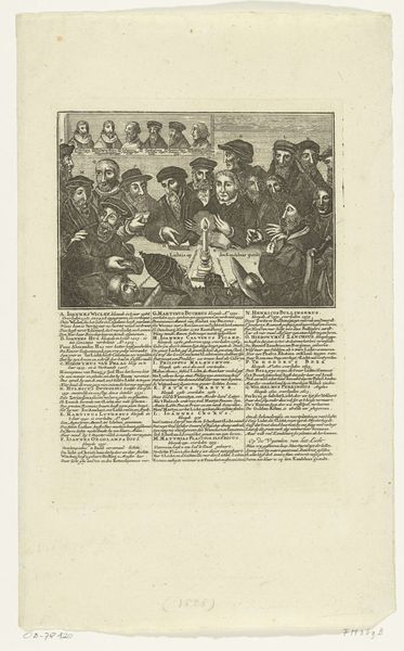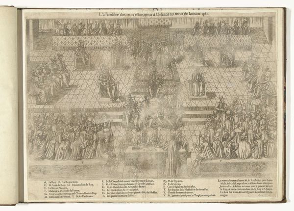 Curator: Let's consider "Colloquium te Poissy, 1561," an engraving in ink attributed to Jacques Tortorel, created around 1570. It documents a pivotal moment during the French Wars of Religion. Editor: Immediately, I’m struck by the overwhelming sense of order; the grid laid over the space feels almost… oppressive. Curator: Precisely! That grid organizes the chaos of religious and political discourse. The Colloquy itself was Catherine de Medici’s attempt to reconcile Catholics and Protestants, an effort to quell the rising religious tensions tearing France apart. Editor: But look at the distribution of figures within those squares; it highlights a clear hierarchy. The monarchs are separated from the religious figures. The table dividing them is creating clear binary oppositions. It’s almost diagrammatic. Curator: Indeed. The positioning of figures, the strategic deployment of space - each element communicates power dynamics. The artist uses the architecture to underline religious segregation. We are looking at an attempt of dialogue represented with visible structural oppositions. The result shows failed negotiations which further inflamed sectarian divides, contributing to violence. Editor: Yes, the use of line itself—the crispness and almost clinical precision—underscore this atmosphere of rigidity and perhaps even futility. Curator: It underscores the broader implications of these seemingly ordered structures, these 'civil' dialogues which often serve only to exacerbate existing inequalities. Consider the role of women. Where are their voices within this so-called discussion? Editor: That absence speaks volumes. I initially saw order, but now I see the carefully constructed foundations of exclusion. Curator: It forces us to examine how historical events continue to echo in contemporary struggles for justice. Editor: What initially seemed like a rather detached, almost cold, rendering of an event now pulses with the very real tensions of the time, doesn't it? It’s chillingly effective.