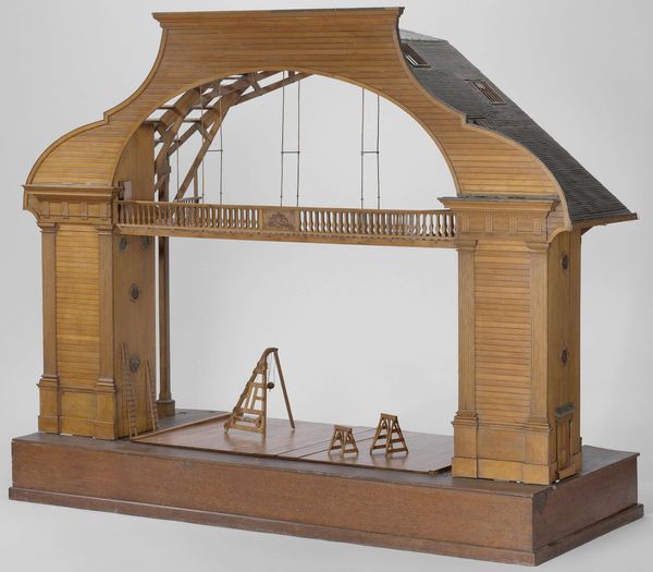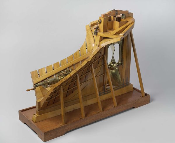 This is the Rijkswerf Rotterdam's model of a drawbridge, crafted from wood and metal. The structure's earth-toned materials and angular composition immediately bring to mind the intersection of engineering and artistry. The model's careful construction highlights its structural components, with attention to the interplay of weight and balance. The drawbridge, an emblem of transition, becomes a study in how forms create meaning. The chains, rods and wooden beams aren’t merely functional; they form a visual language, an alphabet of design that speaks to both the practical and the symbolic. The bridge, in its ability to connect and divide, mirrors the semiotic tension between presence and absence, stability and change. Note how the bridge is suspended in mid-operation; this frozen state implies potentiality. The model invites us to consider how design elements not only serve a purpose but also act as cultural signs, shaping our understanding of space, access, and the built environment.
