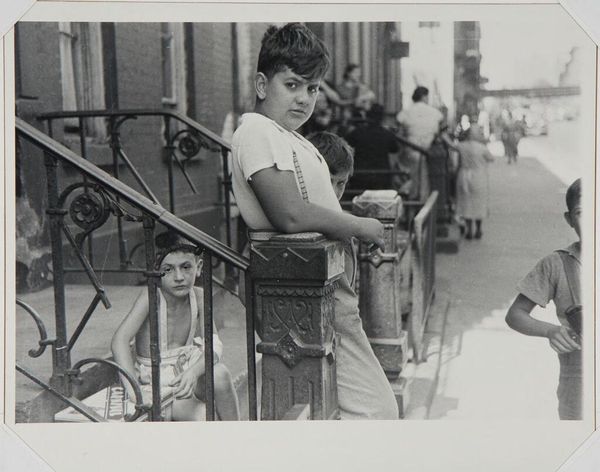 Editor: This is Helen Levitt's "New York" from 1971, a color photograph. The two children near the candy machines create such a melancholic atmosphere, while the color scheme gives a very old-school vibe. What's your read on it? Curator: I find in Levitt’s work a constant, almost anthropological inquiry into the rituals of childhood played out against the backdrop of urban life. What symbols do you see repeated in her works? Editor: I've noticed she captures fleeting moments with an emphasis on gesture, like how the girl holds the cup with a straw. How might that emphasize emotional depth? Curator: Consider the repeated motif of the street corner as a stage. Levitt isn’t simply documenting; she's curating a specific cultural memory of New York. Notice how the cool blue tones of the building contrast with the warm hues of the children's skin and the gumball machines. Editor: Absolutely, there's a sense of staged theatre. It's quite clever how she uses colors to highlight the distance between those children and their surroundings. Is she saying something about New York here? Curator: Precisely! Perhaps that constant negotiation between individual experience and the collective identity of city life? The children become allegories for innocence navigating an increasingly complex world. This contrast is a cultural obsession, isn’t it? Editor: I see what you mean! It's less a straightforward snapshot and more a layered portrait of a place and time. What remains with you when seeing a picture like this one? Curator: A deep sense of human resilience and continuity. Levitt captured how play persists even within the harsh realities of urban life. It reminds us of our shared narratives and experiences. Editor: Thank you! I now have a much greater appreciation for the artist's subtle ways to comment on urban life.