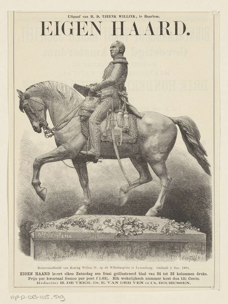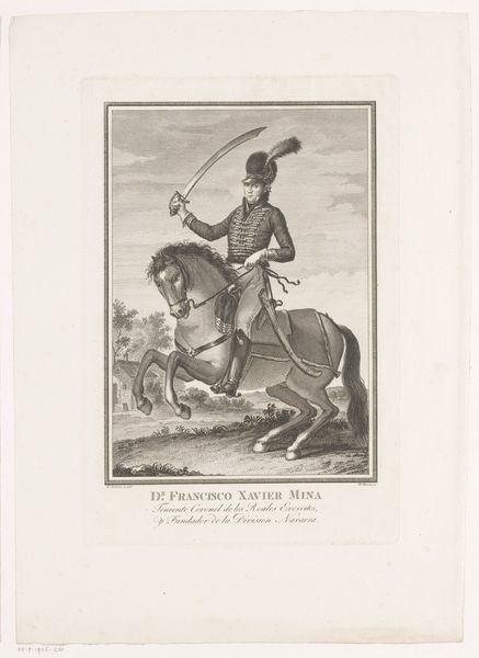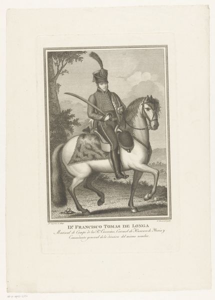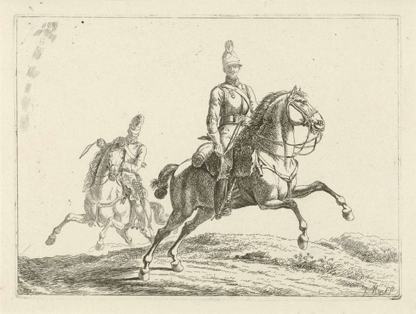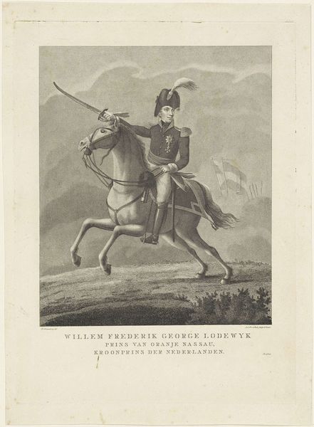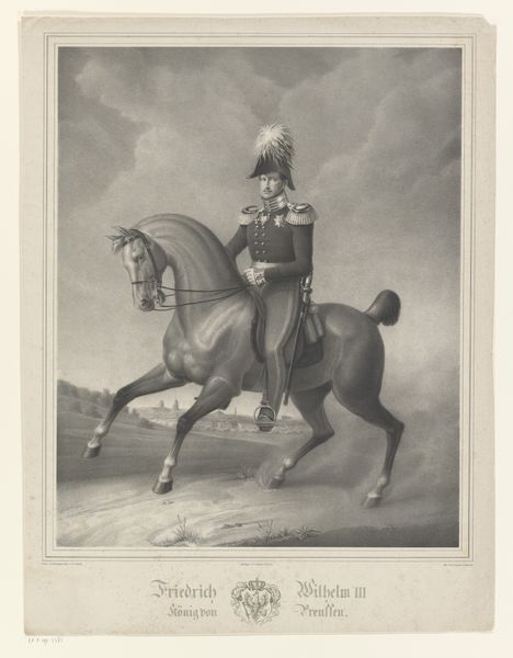 Editor: This print, "Equestrian Portrait of William II, King of the Netherlands," made between 1822 and 1845, captures the Prince of Orange on horseback. It’s fascinating how much detail the anonymous artist was able to render using only engraving. What catches your eye about this work? Curator: I’m drawn to the materials used to create this image. This is an engraving, a medium which requires immense skill and labor. The production process itself becomes a key point of consideration. Think about the socioeconomic context of the time – who had access to printmaking? Who was consuming these images and how might that consumption reflect larger social hierarchies? Editor: So you're saying the choice of printmaking over, say, painting is significant in itself? Curator: Exactly. Printmaking made images accessible to a broader audience, yet the creation was still controlled by skilled artisans and, often, commissioned by the elite. The dissemination of royal portraits, reproduced en masse, becomes an interesting intersection of power, labor, and visual culture. What about the image itself? Does the prince seem accessible or powerful? Editor: Definitely powerful, but somewhat…distant? Almost manufactured. Thinking about it now, it seems this work shows how printed materials help produce and sustain particular ideals, and it does hint at the intense labor involved in its making. Curator: Precisely! By focusing on the means of production, the very materiality of the print, we can uncover a richer understanding of the historical and social forces at play in this depiction of royalty. Editor: That really changes how I see the piece; I was focusing solely on the portrait itself. Considering its materiality opens up a whole new perspective on art’s relationship to labor and social class.