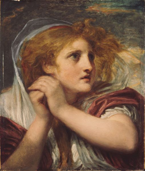Curator: Welcome. We're looking at Alexandre Cabanel's 1875 painting, "Mary Magdalene at the Tomb." Editor: Immediately, the chiaroscuro grabs me—a somber background dramatically spotlighting the figure. It's almost theatrical, wouldn't you say? Curator: Absolutely, a hallmark of the Romantic style he adopts. But look closer. Cabanel's Magdalene exists within layers of complex and contradictory roles. We see her both as a biblical figure but rendered in this hyper-sensual manner that speaks to deeply rooted patriarchal anxieties about female sexuality. Her hair cascades like spun gold. Editor: Yes, her body almost merges into the white fabric of her gown. Notice the use of light; how it defines form, almost sculpting her presence. The dark background flattens, emphasizing her volume and projecting her forward. And there's that incredible luminosity of her skin. Curator: Which speaks directly to his training and historical moment. Remember, Cabanel was a leading academic painter, favored by Napoleon III. Paintings like this were vehicles to express deep, conflicting tensions inherent in French society. Consider the composition, her gaze is upward, suggestive of spiritual contemplation. But the composition is undeniably charged with sexuality. How do we reconcile these complexities, the woman, the saint, the Magdalene? Editor: I am drawn to her expression, too— the slight parting of her lips, and the intense way she looks up. A sense of vulnerability and anguish but also expectation. You know, you mentioned anxieties, but I think we see that push-pull effect, visually as well. The contrast between sharp focus in her face and hands against the softer diffused fabric suggests it even on a formal level. Curator: Precisely! It reflects not just artistic technique but a broader socio-political canvas. A woman wrestling with faith, desire, social constraints. Cabanel captured this moment, perhaps unwittingly, creating space for future generations to contemplate women and the expectations society imposed on them. Editor: What I'll remember most, I think, is the palpable tension he creates through those light and shadow effects. It evokes a moment, hanging in the balance, filled with uncertainty, anticipation, and, perhaps, the faintest glimmer of hope. Curator: Indeed. Through her Cabanel provides a touchpoint through which to reconsider narratives about female figures both real and imagined throughout time.