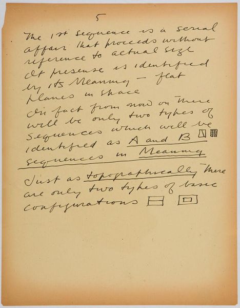 Curator: Here we have Stuart Davis’s “Art Theory Text with Types A and B Configuration Diagrams.” Editor: It looks like a page ripped from a notebook, full of equations and thoughts. Curator: Davis was obsessed with systematizing art. Look at the date at the top, March 1, 1942; this coincides with his deep dive into abstract structure. Editor: It reminds me that artists are thinkers, processing their world, developing theories about its meaning that they then render visually. Curator: Exactly. And to see Davis's process, his wrestling with these ideas, gives us insights into his paintings, as well. Editor: It’s like glimpsing the artist's mind at work. Curator: Precisely, a glimpse at the scaffolding on which a lifetime of paintings would stand.