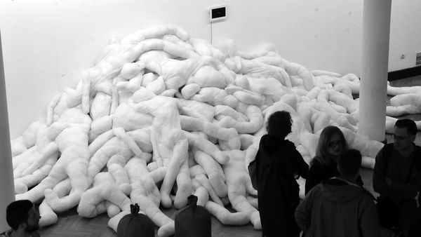 This is Ernesto Neto's installation, "Oinhomoland 'ameioba, scapeiode 'plaiasmioic". The vast, undulating landscape of translucent fabric immediately envelops you. This immersive environment, filled with organic forms and soft textures, alters our sense of space and challenges conventional architectural boundaries. Neto’s work plays with the phenomenological experience, blurring the lines between sculpture, architecture, and the body. The scale encourages us to reconsider our physical relationship to space, engaging with it on a visceral level. The structures and textures, combined with the subdued light, evoke a sense of the primal, inviting contemplation on the origins of form and being. This work destabilizes our understanding of boundaries—between inside and outside, individual and collective. It invites us to explore how we engage with space not just visually, but through tactile and sensory experience. It is this merging of form and experience that challenges fixed perceptions and opens a dialogue on the nature of existence and perception.