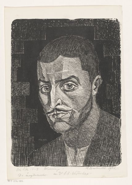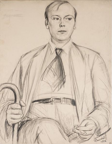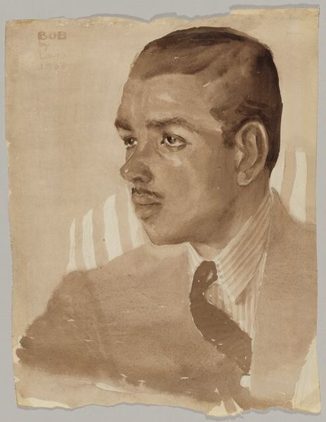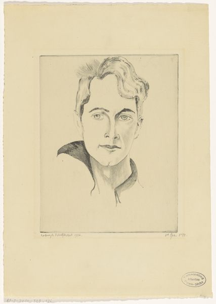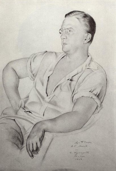 Editor: Here we have George Platt Lynes’ “Self-Portrait,” a black and white photograph. It’s striking how the denim jacket contrasts with his almost classical facial features. What symbols or meanings do you find embedded in this image? Curator: The denim, a symbol of American working-class identity, juxtaposed with Lynes's refined gaze and carefully styled hair creates a fascinating tension. Consider denim’s evolution. It shifts from rugged practicality to high fashion, reflecting evolving societal values. Does this photograph memorialize transformation? Editor: That's a great point. I hadn't considered the class implications of the denim at all. I was too focused on his expression. Curator: Expressions are potent symbols themselves. Lynes' pensive look invites introspection. This photograph might also be a form of self-mythologizing through carefully chosen signifiers. Editor: So, by consciously controlling the image, he controls the narrative? Thanks, I see that tension much more clearly now.