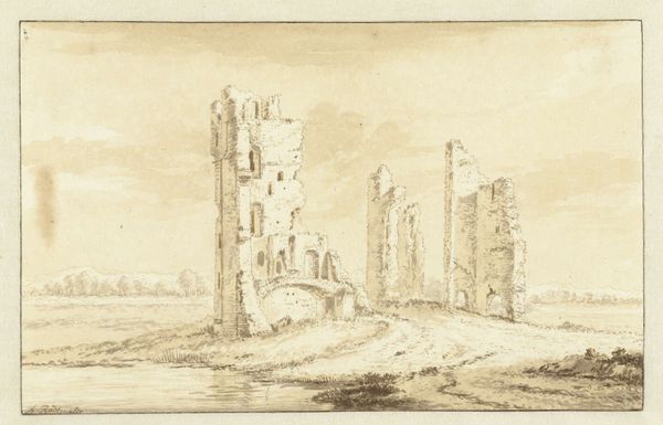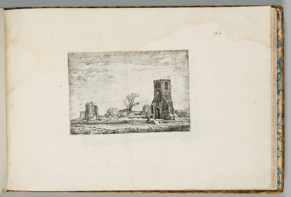 Curator: Willem Pietersz. Buytewech, an artist who died quite young, created this etching, "Ruins of the Castle Huys te Kleef near Haarlem." Editor: What strikes me immediately is the somber mood, achieved through the stark contrast and delicate lines. The composition really emphasizes the fragmented architecture. Curator: The castle ruins are indeed the focal point, but it's important to consider how castles represent power structures of the time. Buytewech captured the dissipation of that power, perhaps reflecting socio-political changes in the Netherlands. Editor: And the sky, almost dissolving into the architecture, it's as if nature is reclaiming what was once imposed upon it. The texture created through these varying densities of lines is remarkable. Curator: Perhaps it signifies the futility of human endeavors, this crumbling testament to ambition. Editor: A memento mori expressed through the language of architecture and light. Curator: It’s a poignant reminder that even the most formidable structures are eventually subject to decay and change. Editor: A beautiful and sobering visual poem, indeed.