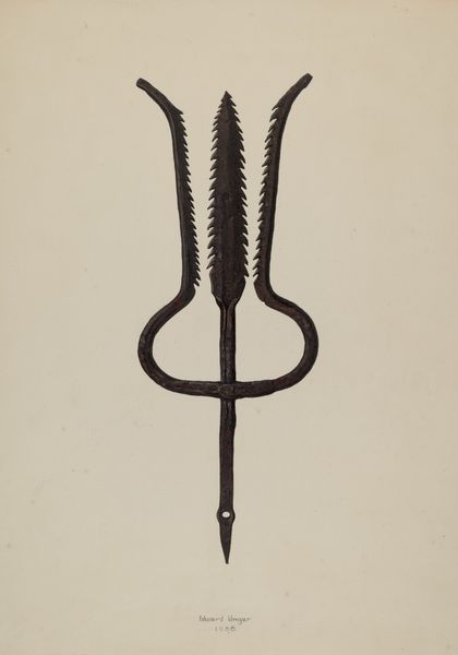 This ‘Sturgeon Spear’ was made by Samuel Faigin, and it’s rendered with graphite and watercolor on paper. Look closely, and you can see the real subject here is the process itself. The artist doesn’t hide his workings. The graphite lines are clearly visible, providing an almost diagrammatic structure, which is then animated by loose washes of color. Up close, you can see the texture of the paper coming through. In places, the paint is built up to give a mottled, rusty quality. The artist really wants us to feel the weight and age of this object. I love the tiny, almost ghost-like drawing of a fork in the bottom right corner. It makes me think of how the artist’s mind might have been wandering, seeing connections, and making intuitive leaps. It reminds me that art is a form of ongoing conversation across time, and that it’s always open to multiple interpretations.
