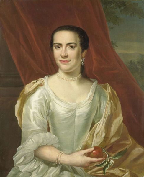 Curator: Before us is a canvas rendering a "Portrait of Marchesa Concina di Udine," crafted by Pietro Longhi, though we are unable to confidently assign it a year. Editor: My first impression is one of subdued elegance; a muted color palette and a somewhat austere composition draw my eye. There's a softness to it, yet also a formality. Curator: Absolutely, the composition lends itself to the portrait tradition but I agree, it does not offer all of its secrets easily. The dark book she holds feels quite important; in my view, it symbolizes intellect and status, markers of Marchesa Concina’s elevated social standing. But there is also a bit of secrecy in how closely it is guarded. Editor: I’d argue that the book, while suggestive, also serves a purely structural function. Longhi’s juxtaposition of the dark volume against the Marchesa’s light garment anchors the composition and draws the eye back to center. The chiaroscuro here provides both drama and balance. Note, too, the precise, almost mathematical rendering of the folds in her dress. Curator: I'm drawn to the head covering itself, which, against the social backdrop of 18th century Venice, would signal a complex array of social codes. Marchesa Concina seems, if I am not mistaken, as veiled and hidden away as her expression makes her out to be. Editor: That might be, or perhaps the somber mood emerges from Longhi's technique, layering thin glazes of oil paint to build luminosity and depth. The modeling is subtle but impactful. We have in place here an instance of how Venetian painting achieves remarkable texture while still feeling light and airy. Curator: Seeing past the aesthetic treatment, it strikes me: is the painting itself enacting an expectation of class and of gender roles? How might its meaning differ from present times? Editor: Perhaps it asks us to consider the very function of portraiture. In Longhi’s Rococo era, what are we expected to read in a Marchesa's presentation? Curator: It's the kind of face that lingers; its enigmatic character resonates through time. Editor: Indeed, and regardless of what we ascribe to it, we can all appreciate the craft in such a subtle composition.