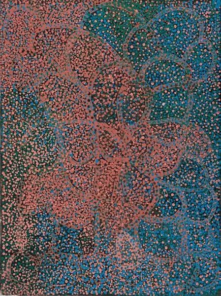 Curator: Today, we’re looking at an acrylic painting titled *Desert After Wintertime* by Emily Kame Kngwarreye. Editor: My initial impression is one of subdued vitality. It evokes the feeling of a landscape subtly reawakening, a delicate shift after a period of dormancy. There's a sense of burgeoning life just beneath the surface. Curator: Indeed. Kngwarreye's style, particularly evident here, demonstrates a unique exploration of the abstract, almost pointillist effect of dots within landscape painting. Let’s think about composition and color. We have soft greens and yellows punctuated by these earth-toned oranges that create a texture that speaks to a field, perhaps after the first rains. Editor: Absolutely, and when situating her work within the narrative of Indigenous Australian art, one cannot ignore its profound connection to the land and to Country. There is a beautiful story here of resurgence. The painting acts as an act of resilience by documenting seasonal transformations. What kind of commentary can we add that doesn't perpetuate common tropes? Curator: If we delve further into the formal elements, we could observe how the rhythmic application of paint across the canvas challenges our conventional ideas about pictorial space. This work embodies the principles of abstract expressionism where the materiality of paint, through the dot and dappling marks, allows for an image without firm gestural applications or grandstanding effects. Editor: But isn't that the tension – or dialogue between art and life that is especially heightened here. Kngwarreye’s individual visual vocabulary doesn’t operate in a vacuum but builds upon ancestral knowledge in relationship with place and ecological patterns of that landscape. This kind of work also reshapes our perspectives, right? Curator: It’s true, the piece allows us to see an intricate abstractness—that reality isn't just about representation, it's about embodied experience. Editor: Yes, and one rooted to this place as a gesture that goes far beyond its aesthetic experience. Curator: I am glad you brought the dimension into the mix. It makes me see the visual strategies in relation to the context. Editor: Absolutely. So what do we make of that connection, Curator? What feelings linger?