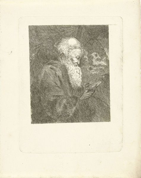 Curator: This is James Ensor's self-portrait, etched in 1889, titled "My Portrait with Skull." Editor: Disturbing, immediately! The figure emerges from this murky background with an unnerving clarity. The skull... it feels superimposed, doesn't it? Deliberately placed over his own features. Curator: Ensor, during the late 19th century, challenged societal norms through his art. He was critiquing the bourgeoisie, and his preoccupation with mortality, with themes of vanitas, reflected a wider fin-de-siècle anxiety. Consider, too, his social isolation at this time; his family was in decline, his artistic choices increasingly controversial. Editor: Yes, the cross-hatching definitely adds to the feeling of unease. It’s almost frenetic, chaotic. It breaks down any smooth transitions and creates a visual tension that is quite effective, and unnerving, as I said. I can’t quite place what's on his head – it seems that he wanted to crown it with with vegetal life – which strikes me as poignant. The man himself is facing right but slightly away as if he knows there is something wrong in the air. The death’s head reminds him every moment that it's never too far away... The whole thing really feels morbid. Curator: Ensor returned repeatedly to self-portraiture, often incorporating grotesque imagery and the symbolic use of masks, skeletons, and his view of humanity’s inherent ridiculousness. These self-portraits provided a space for self-exploration but also, more significantly, they provided opportunity for critical social commentary. And here the self-portrait allowed Ensor to embrace a profound critique of the times. Editor: There is that subtle light, illuminating one hand—a strangely calm hand for all of that, seemingly holding its own amidst all this turmoil. Perhaps indicating that Ensor retained a calm vision in his mind... A beacon amid decay, literally— it leads the eyes through this piece, providing some balance within the otherwise nervous arrangement. It's intriguing how something so minimal carries such weight. Curator: Absolutely, it shows how art engages in more extensive socio-political critiques and artistic dialogue within the modern era. It forces viewers to reconsider social stability and mortality through this art. Editor: I’d agree, in Ensor’s etching there is an engagement beyond merely form, one in which you also witness that profound, quiet rebellion against death itself.