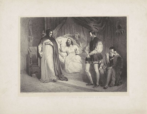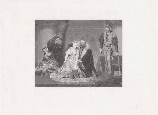 Editor: This engraving by Paolo Mercuri, entitled "The Execution of Lady Jane Grey," dates from 1833 to 1884. It's immediately striking for its dramatic use of light and shadow. What do you notice first when looking at the composition of this engraving? Curator: Primarily, I am drawn to the chiaroscuro. Note the dramatic contrast. The pool of light focuses our gaze directly on Lady Jane, emphasizing her vulnerability, set against the darker tones enveloping the supporting figures, architectural pillars, and accessories within the scene. The textural variations are noteworthy, achieved solely through the manipulation of line density in the engraving. How effective do you think the engraver is in suggesting varied tactile surfaces, considering the limitations of the medium? Editor: I think it's extremely effective! The way the light reflects off Lady Jane’s dress creates the illusion of silk, despite being just lines. And the texture of the straw she’s kneeling on also feels very palpable. Is there any meaning in these choices of material representation? Curator: It serves to heighten the tragic tension, emphasizing the cruel juxtaposition of nobility and impending death. Beyond the anecdotal, the work becomes a study in the play of light and dark and texture itself. Are there particular elements, formally, that you feel work well or less well within this dramatic schema? Editor: I find the figure in the background, the executioner, to be almost too static, in contrast with the dynamic figures on the left. What purpose does his stiff pose achieve? Curator: One can see it instead as contrasting stillness. The executioner, although passive at the point, represents a contained force about to be released in dynamic and tragic motion, further elevating the sublime through restrained action. Formally, this anticipates resolution, and resolution through violence. Editor: I now appreciate how all figures are indeed contained, not so much in stillness, but tension, which works to a striking effect. Thank you. Curator: And I value your initial impulse that lead to deeper appreciation of a contained, pregnant moment through skillful management of tonality.