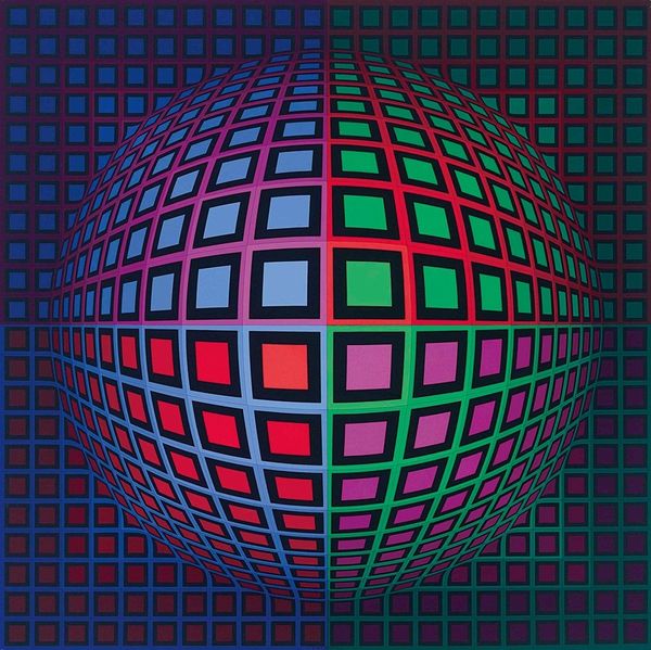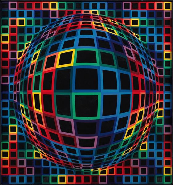 Curator: Here we have Victor Vasarely's "Vega-Nor" from 1969, an acrylic on canvas. What strikes you most immediately about it? Editor: It feels like staring into a very stylish, geometric black hole. The way the grid bends and curves is unnerving yet beautiful, and kind of makes me want to reorganize my closet. Curator: Precisely! Vasarely’s work hinges on the disruption of the stable Cartesian grid. Observe how he manipulates color and form, presenting a convex distortion on a flat plane. It’s an exploration of optical illusion and perceptual experience, wouldn't you agree? Editor: Totally! It's playful, too. Like he’s saying, "Hey, reality's bendy, have some fun with it." The color choices, though deliberate, give off this groovy, late 60s vibe, too, despite the intense precision. Curator: His methodology involved rigorous preliminary sketches and mathematical calculations. Semiotics play a crucial role; each square acts as a signifier, contributing to the overall illusion of spatial depth and movement. Note the colour relationships. How do they influence depth perception? Editor: For me, it’s about the contrast; like how the vibrant reds and yellows fight against the cooler blues and greens. This tension keeps the eye dancing around, never quite settling, which amplifies the whole bending illusion, wouldn't you say? The title, "Vega-Nor", feels space age, and brings a level of abstraction to it all. Curator: Indeed, abstraction here enables Vasarely to achieve universality, an objective visual language as he called it. The interplay between figure and ground challenges our visual assumptions. Editor: You're right. It does makes you question what's real. This makes me wonder, did he ever get dizzy looking at his own art? Because I sure would. Curator: It's a potent reminder that perception itself is constructed. Editor: Well, I'm now seeing my world as a bendy, psychedelic grid and my perception of reality has definitely been tweaked. Curator: That is, perhaps, the ultimate goal of Op Art: a transformation of vision.