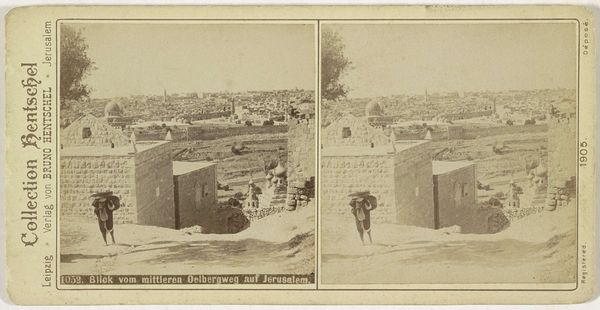 Curator: What a compelling view! This stereo card presents us with "View of Toledo" by Jean Andrieu, likely taken between 1862 and 1876. The vantage point itself seems rather remarkable. Editor: I'm immediately struck by the way the composition pulls you in. The rock formations in the foreground create a visual anchor before the city unfolds in the distance. The tonality is incredibly warm—almost sepia-toned—adding to a sense of historical distance and gravitas. Curator: It’s the inscription, "Vue prise du Sépulcre du Roi Maure", that interests me. The image is taken from what was believed to be the sepulchre of a Moorish king. It connects the viewer to the layers of history embedded in Toledo’s very foundations: the Visigothic, the Islamic, and finally the Christian Reconquista. The city’s architecture, a fascinating palimpsest of cultural forces. Editor: Yes, there is a visual layering in the photograph, too! See how the artist places that rocky outcrop so deliberately? It disrupts the direct line of sight, fragmenting our view and suggesting the intricate history beneath what’s presented. Look at the details in the town structure – and even in that, the tower becomes the apex with smaller features cascading down the hillside in comparison. The photographic process allows the detail to draw the viewer closer. Curator: The position and framing certainly emphasize Toledo's endurance. The city has become this cultural and geographical stronghold! It is photographed from a site loaded with history. That placement suggests memory, or cultural continuity through loss. Editor: The artist had an eye for space. Considering the composition and that incredible texture in the rocks, it offers us such a beautiful balance of forms and tones. I find the image so carefully designed. Curator: Yes, Andrieu is inviting us to contemplate the flow of history through physical spaces. It’s a romantic perspective—almost mournful—suggesting that the present is always informed by what came before. Editor: The work showcases not only the landscape itself, but the meticulous choices behind its visual capture, making it a piece of art with its own intricate structure. I never realized how thought-through these city-scapes were!