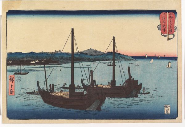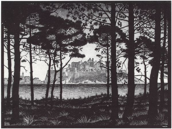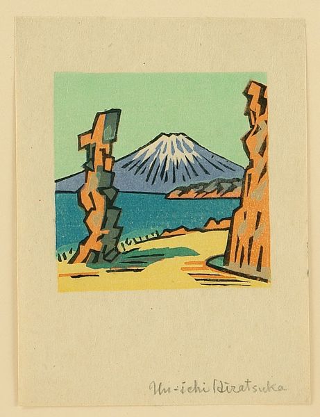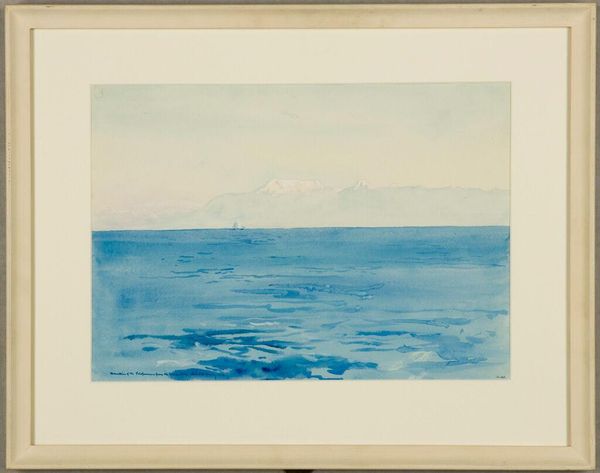Editor: This is Watanabe Kako’s 1936 watercolor, "Avondgloed in het Nishi park in Fukuoka." It’s incredibly serene; the dark trees frame this vast, calm body of water. What social or political tensions might be subtly present in this scene? Curator: Given the rise of militarism and nationalism in Japan during the 1930s, even a landscape like this can be read as a reflection of those tensions. Do you see how the dark, almost oppressive trees seem to guard or obscure the peaceful scene beyond? Editor: I see that now! The silhouette of those trees *does* feel a bit imposing, almost like a barrier. It's such a contrast to the tranquil sunset and water. Curator: Precisely. Consider also how representations of nature were often used to reinforce ideas of national identity and cultural purity during this period. Was this a reinforcement, or something else? Does the artist celebrate tradition, or question it through composition? Editor: I hadn’t thought of it that way. The trees feel like gatekeepers of a traditional vision, perhaps. Was the artist resisting or engaging with the dominant ideology? Curator: It's precisely this ambiguity that makes the work compelling. This subtle resistance is part of its power, wouldn't you say? Even quiet, nature-focused art couldn't escape the political currents of its time. Editor: Absolutely. Thinking about art in this context helps to unveil how it impacts broader dialogues around identity and politics. Thank you! Curator: It is imperative for us to think through art. My pleasure!