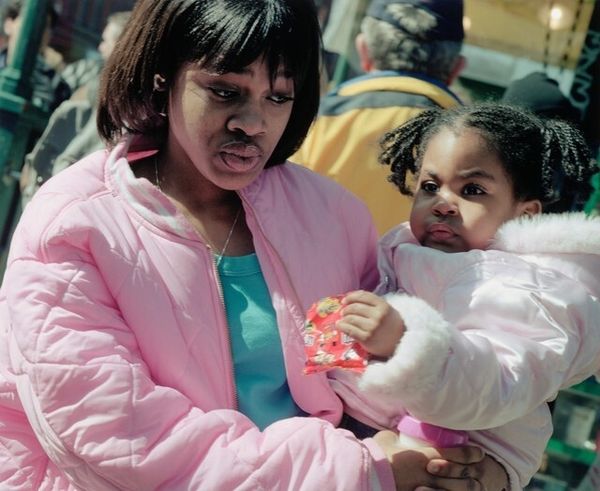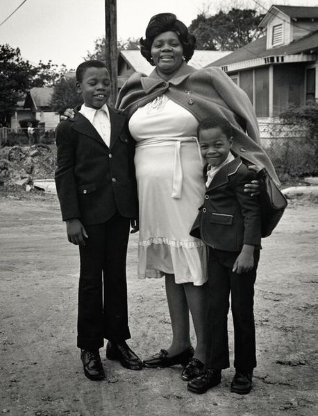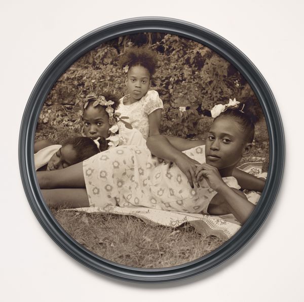 Editor: This is Nancy Andrews' 1993 gelatin-silver print, "Nelita Williams and Barbara Hudson." The mood is just so joyful! What strikes you about this photograph? Curator: It’s powerful, isn’t it? Andrews captures this everyday moment with a quiet intensity. Black and white photography like this throws into sharp relief the nuances often lost in color, the play of light and shadow becoming metaphors. I'm particularly drawn to the expressions of the women and children and wonder, what does this image tell us about community and resilience in 1990s America? What narratives might they embody? Editor: That’s interesting. I was focused on the expressions, but not the historical context. Were there specific social issues Andrews was addressing at this time? Curator: Andrews often uses her work to explore themes of identity and representation, particularly within marginalized communities. This piece could be seen as pushing against stereotypical depictions, instead presenting an intimate portrait of Black family life and matriarchal strength. The women's shared laughter becomes a symbol of defiance. Considering bell hooks’ writings on the power of Black female visibility, how does this photograph speak to or challenge that concept? Editor: I see. It shifts from being a simple portrait to a statement. Do you think the choice of gelatin-silver print contributes to that message? Curator: Absolutely. The medium itself has a historical weight, connecting the work to a legacy of documentary photography and social commentary. The rich blacks and luminous whites add a gravitas, imbuing the subjects with dignity. This piece urges us to really *see* them, not just as figures in a photograph, but as individuals with stories and lived experiences. Editor: I’ll definitely be thinking about this in a different light now. Thanks for sharing that perspective! Curator: My pleasure! I’m eager to see how you explore this in your future work.