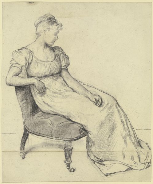 Curator: This is John Downman’s *Woman Seated in Roman Chair*. It is an ink and graphite drawing on paper. Editor: Spare, isn’t it? The severe angles of the chair contrast with the fluidity of her draped gown. The figure is drawn with impressive economy, a mere sketch really, but powerfully suggestive. Curator: The sketch is fascinating because the neoclassical setting is so carefully rendered: the Roman chair, her Grecian-style gown and headwear, her almost stoic expression. I find myself considering what classical ideals might have resonated with Downman's audience. She’s the embodiment of composure in this carefully constructed vision. Editor: Note, too, the way the chair’s legs ground the figure. And how her sidelong glance directs our attention to the blank space beyond. There’s an incompleteness here that generates meaning. Semiotically, the open space functions almost as another character in the piece. Curator: Or perhaps it represents potentiality—the woman considering a new path based on the document in her hand? It brings to mind the rise of the leisured class, reading becoming a central attribute in conveying their power, virtue and discernment. This posture suggests that the very act of considering is fraught with expectation, but also consequence. Editor: Perhaps. I can’t help but focus on Downman’s skilled rendering of tone, of how he creates a complex form with what are essentially just a series of lines. The chair almost disappears into her dress. Note the shadow work. A very subtle play between the implied and explicit, and what emerges is an almost ethereal interpretation of the academic style. Curator: Agreed, and even her features, almost masklike, hint at those societal forces operating just beneath the surface. A very quiet statement about societal expectations. Editor: Ultimately, Downman delivers a lesson in economy. How minimal lines and a sensitivity to tone, can create a form. Curator: And that these constructed forms are never neutral. Rather, they carry a historical and cultural weight that invites us to look both forward and backward in time.