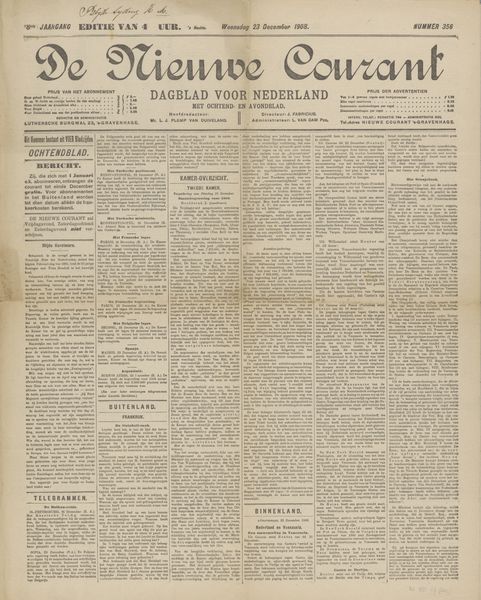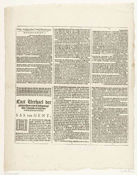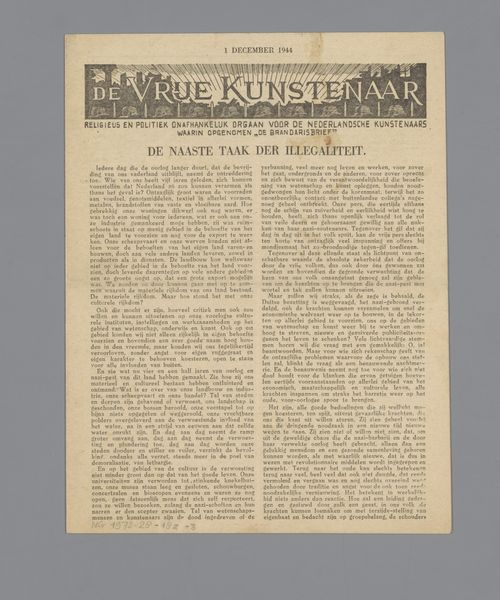 Editor: Here, we have “De Vrije Kunstenaar,” likely from 1945. It's a poster, or perhaps the front page of a publication, made of paper and typography, probably a print. There's something both delicate and assertive about the typography that I find striking. What do you see in this piece? Curator: It's compelling to consider the weight of symbols during times of upheaval. This publication emerged during a period of liberation in the Netherlands, as indicated by "Bevrijdingsnummer" – Liberation Edition. Editor: The title translates to "The Free Artist," right? Curator: Precisely. The symbolism of freedom here, proclaimed so soon after occupation, would have been incredibly potent. Note how the typography itself, though reminiscent of Art Nouveau, feels bolder, more direct. The very act of publishing "De Vrije Kunstenaar," a religiously and politically independent organ, speaks volumes about the recovery of self-expression and cultural identity. Editor: What about the text surrounding the title? It’s hard to read. Curator: It asserts its role for Dutch artists, encompassing “De Brandarisbrief” - a kind of guiding letter to the artists. But also, the text's density, those tightly packed letterforms, contribute to a sense of urgency, of information needing to be disseminated quickly. Editor: So, it’s not just a declaration of freedom, but almost a battle cry for artistic expression. Curator: Indeed. It uses symbolic visual language to signal a cultural rebirth. I am left wondering what discussions this paper triggered and what kind of art it championed at the time. Editor: It's amazing to consider how much cultural memory can be embedded in what might seem like just a simple broadside. Thanks for shedding light on this artwork's cultural significance.
