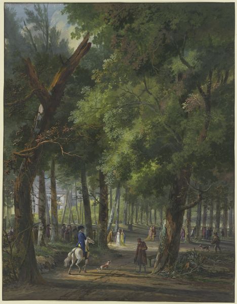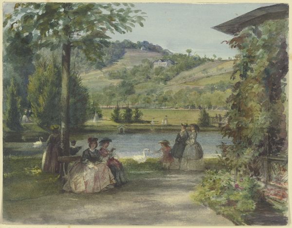 Editor: So, this is Anton von Werner’s "The Artist's Wife and Daughters in a Park at Heringsdorf," painted in 1877. It’s a watercolor drawing. It has such a peaceful, familial mood. What strikes you most about this piece? Curator: What immediately catches my attention is how this idyllic scene participates in and perpetuates certain social and cultural expectations of the late 19th century. Consider the deliberate portrayal of domesticity: the artist’s wife and children in a recreational space, ostensibly enjoying leisure time. Editor: I see what you mean. It does feel very staged. Curator: Exactly. The “plein-air” style suggests a natural spontaneity, but consider the composition and setting. Are we really seeing a candid moment, or is this carefully crafted to convey a specific message about bourgeois life and values? Look at their clothes, the mother overseeing her kids, the setting itself... How might this image have functioned in shaping ideas about family roles and social class? Editor: So you're saying it's not just a pretty picture, but a statement about society at the time? The emphasis on their outfits makes more sense, and it becomes pretty clear these leisurely activities wouldn't be afforded to other people, particularly during this time. Curator: Precisely! The medium itself—watercolor—often associated with delicacy and femininity, adds another layer. How does this choice of medium reinforce, or perhaps even subtly challenge, prevailing notions about women’s roles and artistic expression? It may subtly highlight the expectation for art by women to depict pretty or calm moments rather than tackle complicated topics or materials, don’t you think? Editor: I never considered the medium like that. This artwork feels much more complex now, not just a fleeting scene! Thanks. Curator: Of course! It’s these embedded layers that make art so engaging; by considering them, we actively confront not only its creation, but reception.
