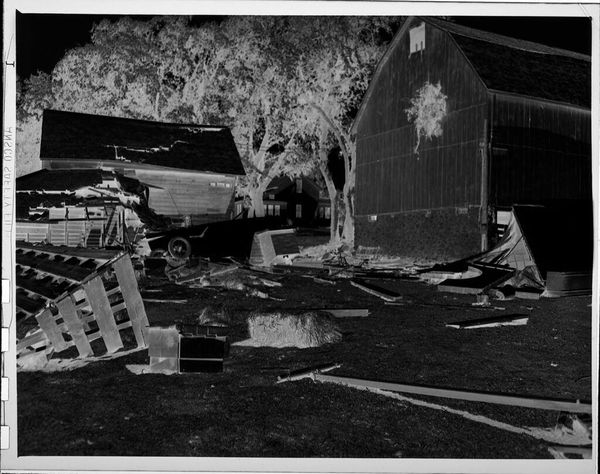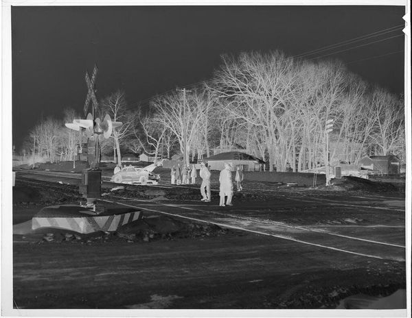 Curator: This is an untitled photograph by Harry Annas, currently held in the Harvard Art Museums collection. The dimensions of the image are roughly 12.7 by 10.16 centimeters. Editor: Stark! The high contrast and limited grayscale create a very heavy, almost oppressive atmosphere. The equipment looms. Curator: Indeed. Annas’s composition, focusing on oil well equipment and the obscured figures of men working, speaks to the industrialization and labor of the oil industry. The choice to depict this specific scene also gives the viewer a glimpse into a specific moment in time. Editor: It's also about the physical effort, isn't it? Look at the density of the equipment. The weight of materials and the unseen labor, processed and consumed. Curator: Absolutely. The image prompts us to consider the social impact of these industries. Editor: Viewing it through that lens brings the human cost into sharper focus. Curator: Precisely. It’s intriguing how a seemingly simple image can reveal so much. Editor: Yes, a somber look at the mechanisms behind progress.