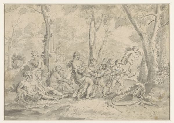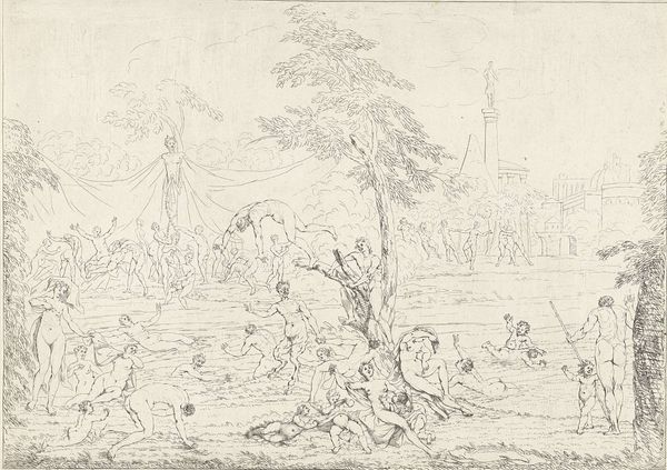 Jean-Baptiste Joseph Pater created this print, Troops Resting, using etching. The print depicts soldiers in repose, set against a backdrop that hints at both domesticity and the transient nature of military life. Note the recurring motif of rest and idleness. In antiquity, the image of resting warriors can be traced back to depictions of Mars, the god of war, often shown disrobed and vulnerable, a stark contrast to his martial prowess. This vulnerability humanizes the soldiers, portraying them as individuals weary from conflict. Consider how these motifs resurface in later works, such as in depictions of the flâneur in 19th-century urban landscapes. The wandering observer, like the resting soldier, embodies a state of detachment and contemplation amidst the bustle of life, a cyclical return to themes of introspection and the human condition. This portrayal taps into our collective memory of struggle and peace, engaging viewers on a profound, subconscious level.