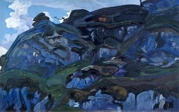 Nicholas Roerich painted 'Mill in the Mountains' with oils, and what strikes me first is the way the cool blues and greens define the solid forms of the landscape. You can really feel the weight of those mountains. Roerich's brushstrokes aren't trying to trick you into thinking this is a photograph. There's a kind of honesty in how the paint is applied, a process that’s laid bare. Look at how the waterfall tumbles down the mountainside: it's a dance of whites and creams, dashed on with visible strokes, capturing movement rather than detail. This makes the image vibrate with energy. There’s a spiritual quality here too, like in the work of Marsden Hartley or Hilma af Klint. Not because of any symbols, but because the handling of paint is so open. Roerich shares with them an openness to seeing art as an ongoing conversation, where meaning shifts and shimmers with each viewing.