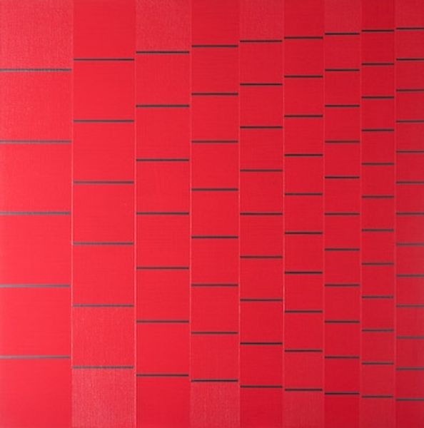 Jeremy Moon made 'Flamingo' with paint, though the exact date of its creation is unknown. There's something deeply satisfying about the contrast here, between the soft, fleshy pink lines and the grounding dark squares. It gives the impression of something being held together. The surface is smooth, almost like it was sprayed. The lines are crisp and precise, and suggest a masking technique. It's cool to think about how that pink shifts from feeling sweet to feeling structural. Look at where the pink crosses over the dark squares. See how those intersections create tiny diamonds? That small formal detail creates a whole new layer of visual interest, it's like a secret code hidden within the larger pattern. Eva Hesse’s grid-like sculptures come to mind here, in the way both artists play with geometry and repetition to create something that feels both ordered and a little bit off-kilter. Art’s like that, isn’t it? A way of seeing the world in new and unexpected ways.