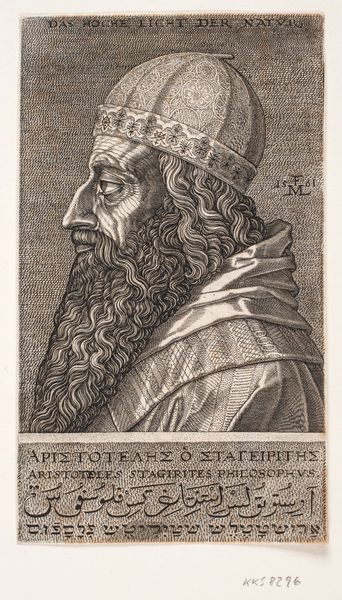 Melchior Lorck’s engraving captures Aristotle in profile, a study in contrasts achieved through line and texture. The philosopher’s iconic features are meticulously rendered, offering a textured surface that defines form and depth. Light etches across the image, casting shadows that emphasize the contours of his face and elaborate headwear. Lorck uses tight, controlled marks to model form, contrasting shaded areas with stark highlights, creating a visual rhythm that invites close inspection. This close attention to detail reflects the philosophical underpinnings of Aristotle's teachings, rooted in empirical observation and detailed analysis of the natural world. The engraving’s structural elements are not merely aesthetic choices; they embody the intellectual rigor and systematic thinking that Aristotle championed. Through the cross-hatching and careful delineation of form, Lorck's portrait becomes a complex interplay of visual signs.
