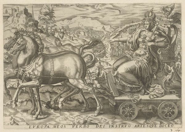 Editor: Here we have "The Triumph of Bacchus" by Etienne Delaune, an engraving created sometime between 1528 and 1583. The frenetic energy of the figures is striking. How do you interpret the symbolism within this piece? Curator: This image reverberates with classical allusions, filtered through the lens of Mannerism. Note the procession – a visual trope evoking both Roman triumphs and bacchanalian revelry. Bacchus, of course, represents liberation, ecstasy, but also a release from societal constraints. Delaune isn't simply depicting a party; he's exploring a deeper psychological space. Do you notice the contrast between the ordered chariot and the wild abandon of the figures? Editor: I do. There’s a deliberate chaos surrounding the central figure of Bacchus that’s hard to ignore. What about the…almost caricatured expressions on some of the faces? Curator: Exactly! Those exaggerations are key. Caricature allows Delaune to explore the darker side of unchecked hedonism. The smiles are manic, the gestures frantic. It's not just celebration; it's a release that verges on self-destruction. This resonates with Mannerist concerns about the instability of appearances and the power of irrationality. Where does that snail fit into the narrative? Editor: I hadn’t even noticed the snail…That definitely throws a wrench into my understanding of a straightforward celebration of Bacchus. It is an odd inclusion, the snail… so out of sync. Curator: Precisely! The snail may be representative of laziness which goes against everything that’s associated to the God of wine himself and to those in the bacchanal scene. Considering the culture context this engraving belongs in, what purpose does the inclusion of that counter-symbol play? Editor: Thinking about the snail really opened my eyes to layers in the work beyond just a surface level depiction. I’m appreciating Delaune's commentary. Curator: Yes, by understanding how images function as carriers of cultural memory, we can grasp Delaune’s subtle critique of excess and the elusive nature of true triumph.