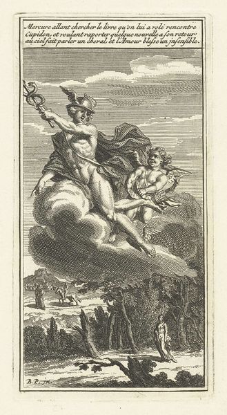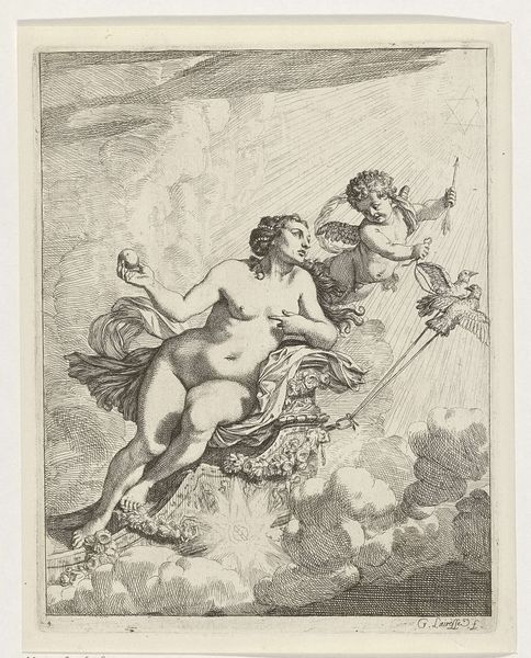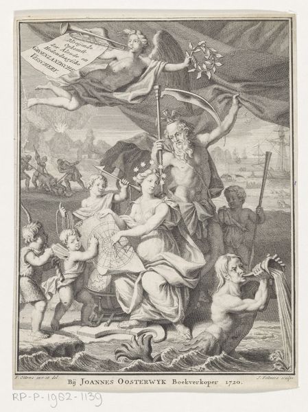 Editor: This is Bernard Picart’s "Triomf van Venus," an engraving from 1724 at the Rijksmuseum. The goddess Venus is depicted riding over the sea, attended by figures from mythology. It has an incredible sense of movement. How would you interpret this work? Curator: This piece reflects the Baroque fascination with allegory and classical mythology, but more importantly the public function of art at the time. Consider that this wasn't made for private enjoyment; prints like these circulated widely, disseminating cultural values and aesthetic ideals. Editor: So, it's not just about the myth, but about spreading an idea? What ideas were circulating when this engraving was created? Curator: Exactly. Think about the Dutch Republic in the early 18th century. This imagery links them to a grand, classical past, legitimizing power and prosperity through association with established, admired cultures. The sensuality and celebration of beauty were not just artistic choices, but endorsements of worldly enjoyment and civic pride, accessible and understandable even by an unschooled public. What do you make of Venus’s pose? Editor: It's very assertive, like she's claiming dominion. The whole scene is idealized, almost a propaganda image. So the placement of the work matters because an idealized god makes their lives, by extension, divine? Curator: Precisely. The Baroque loved a grand spectacle, and this engraving provided that in an easily reproducible form. Now, what do you see as the legacy of such imagery today? How does it inform contemporary image making, given what we know about how power intersects with public life and cultural institutions? Editor: That's definitely given me a new way to look at these classical scenes. I always thought of them as beautiful but disconnected from our lives. Now I can see the politics embedded within. Curator: Indeed. It's crucial to recognize the historical power dynamics in play even in seemingly innocuous artworks. A good lesson!