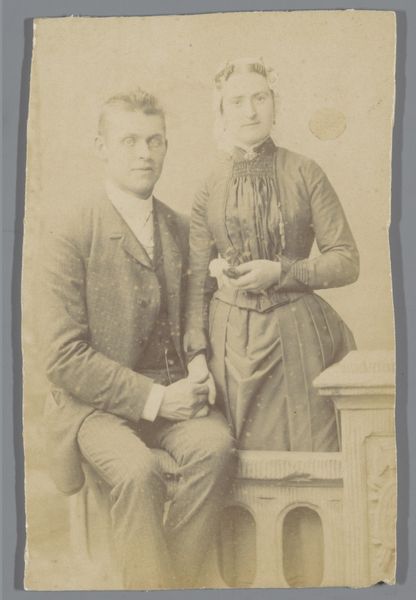 Friedrich Julius von Kolkow made this small portrait of a seated woman and a standing man. Captured in the late 19th century, the photograph reflects the rigid gender roles and class consciousness of the time. The woman is seated, her posture and dress conveying modesty and domesticity, in contrast to the man who stands tall, representing authority and public life. Their physical separation by the balustrade speaks volumes about the prescribed social distances between men and women, as well as the importance of social status during this era. The sepia tone lends a nostalgic filter, yet it cannot hide the power dynamics subtly embedded in the composition. It prompts a dialogue about how identities were carefully constructed and performed in front of the camera. It makes me wonder what stories lie beneath the surface of this seemingly formal portrait. The photograph reflects not just a moment in time, but also the broader societal expectations placed upon individuals based on their gender and class.