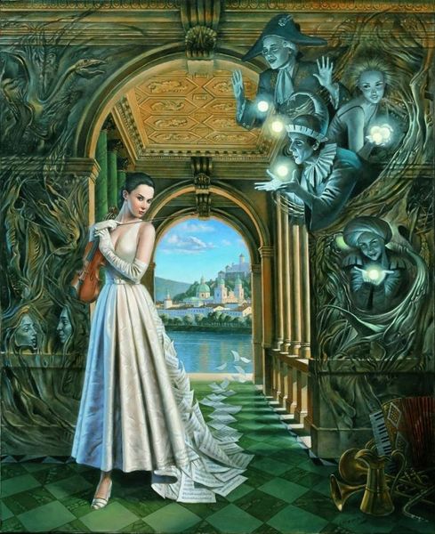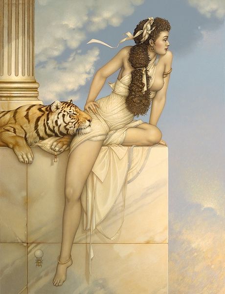 Michael Cheval created this surrealist painting entitled, "Pledge Of Coexistence," featuring a land, sea, and sky dynamic. The painting presents an assembly of surreal characters and objects in muted but bright colors. The horizon line cuts the canvas almost exactly in half, meeting at the center of the treasure chest. The subjects themselves are where the painting is most eloquent. The artist has carefully considered how different species can interact in a shared ecosystem. With its wings outstretched, the seagull brings a string of pearls as an offering to the mermaid with golden scales. The human woman, dressed in a pale blue bustier and white skirt, leans calmly against the treasure chest. The painting has an implied structural system of signs through the way in which it depicts an imagined world in relation to our own. The painting destabilizes established meanings and values, challenging fixed meanings to engage with new ways of thinking about space and perception. The painting is not just aesthetically pleasing, but part of a larger cultural and philosophical discourse.