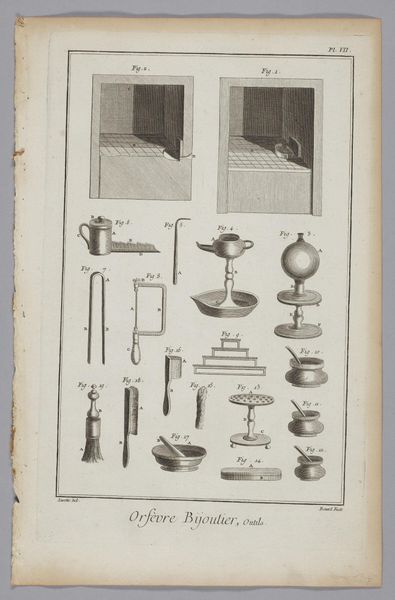 Editor: So, this is "Minting, Gold Tempering and Tools," by Robert Bénard. It seems to show the workspace and tools used for... well, minting! It feels very technical. What do you see in this piece, beyond the obvious? Curator: For me, this image whispers stories of transformation. Look at how Bénard meticulously renders each tool—tongs, shovels, crucibles. It's not just documentation; it's an ode to craft. I imagine the alchemist's fire, the transmutation of base metal into something precious. Do you get that sense of potential? Editor: Definitely! It makes me think about the value we place on objects, then and now. Thanks, I'll look at it differently now. Curator: Absolutely, it's an illustration that transforms into something so much more.