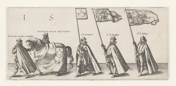 This engraving, "Deel van de optocht, nr. 13," was made by Joannes van Doetechum around the late 16th century. The composition is striking in its arrangement of figures and text, almost like a choreographed display. The eye is drawn to the procession of figures, each meticulously rendered with a sharp contrast between light and shadow. The artist uses line work to create texture and depth. Hatching and cross-hatching define the contours of the figures, their garments, and the horses, giving them volume. This technique, coupled with the restrained palette, creates a sense of gravitas appropriate for a scene of stately procession. The layout of the lettering above each figure feels integrated with the visual elements below, enhancing the overall design. This integration suggests an underlying structure where text and image are not separate, but are components of a cohesive semiotic system.