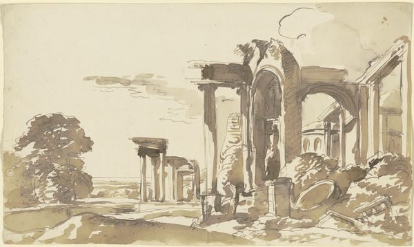 Jacob van der Ulft made this pen and brown ink drawing of Roman ruins in the Netherlands sometime in the 17th century. It evokes the grandeur of a bygone era. During this period, the Dutch Republic, buoyed by its Golden Age, looked to classical antiquity for inspiration, seeking to legitimize its burgeoning cultural and political identity through association with the Roman Empire. Van der Ulft, like many of his contemporaries, never actually visited Rome. He instead relied on prints and descriptions to construct his images of Italy. His interest was not topographical accuracy, but the evocation of a shared cultural heritage. The ruins signify both the glory and the transience of civilizations, a theme resonant with the Dutch Republic's own ambitions and anxieties. The presence of contemporary figures amidst the ruins underscores this dialogue between past and present. To fully understand the drawing's significance, one must explore the broader context of Dutch Golden Age art and its relationship to classical antiquity through period literature, travelogues, and architectural treatises.