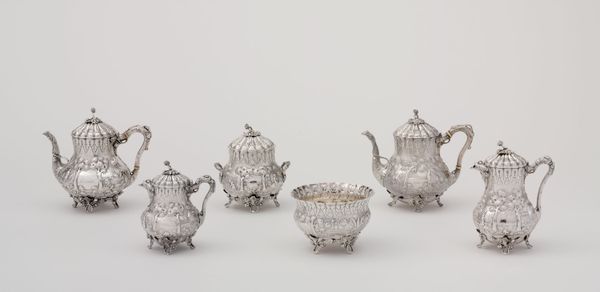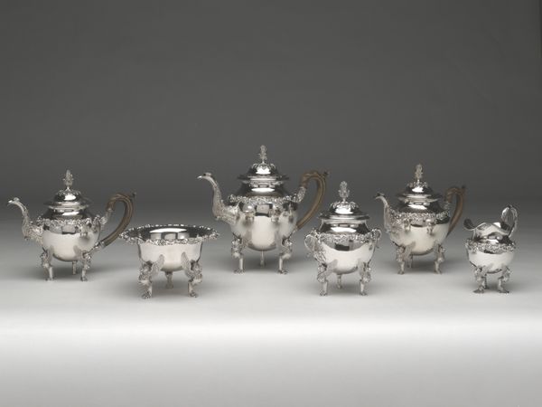 Editor: So, here we have an exquisite set: a creamer, a sugar bowl, and what looks like a teapot. They are all silver or silver-plated metal and ceramic, and were made before 1888 by an anonymous artist. They’re part of the decorative arts collection here at the Institute. It's the incredibly intricate floral designs that strike me most. What symbolic meanings would these carry? Curator: That's a wonderful observation. These pieces immediately speak to the powerful and enduring visual language associated with the tradition of tea or coffee service, and what sharing this means for various cultures. But look closer, what do the botanical patterns evoke in you? Do these repeated images remind you of something in particular? Editor: Well, they do remind me a little of traditional Mughal designs – like patterns on Indian miniature paintings, or perhaps even textile designs I have seen. I guess it points to status and ritual. Curator: Precisely. Floral patterns were incredibly significant, symbolizing prosperity, beauty, and the ephemeral nature of life. The motifs became culturally loaded, signifying power, luxury, and the interconnectedness of cultures through trade and artistic exchange. Can you see how the very act of using this service connects one to that historical narrative? Editor: Yes! Now that you point it out, it becomes evident that the silver and detailed craftsmanship signifies status, but then the familiar patterns indicate the sharing of these designs. It is not only function, but history cast in silver. Thanks for helping me understand this significance of symbolism and what we might have carried forward into current aesthetic. Curator: My pleasure. Every image is a conversation, echoing voices from the past and shaping the conversations of the present. And what will you say about it next?