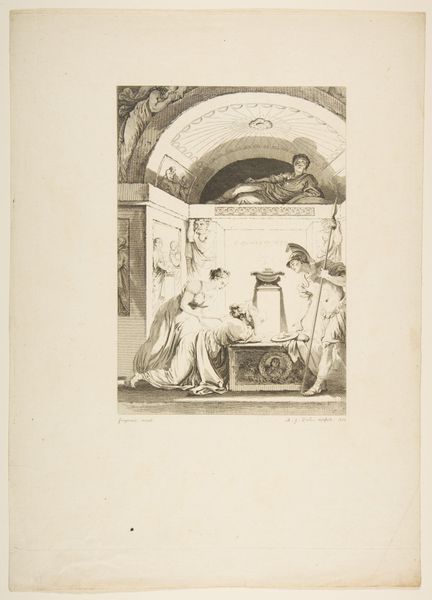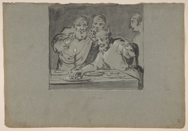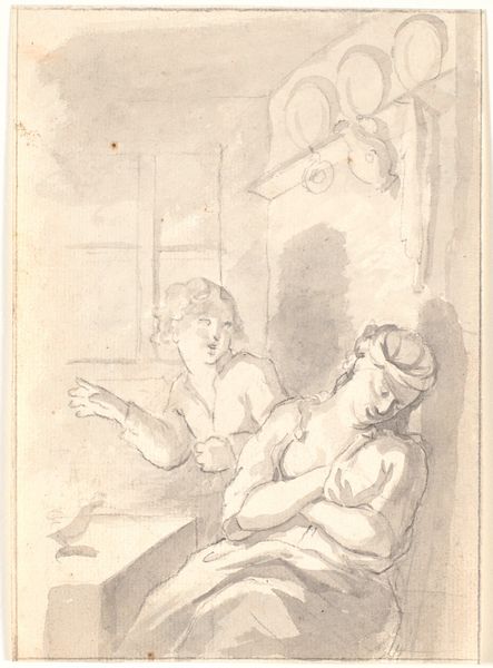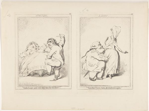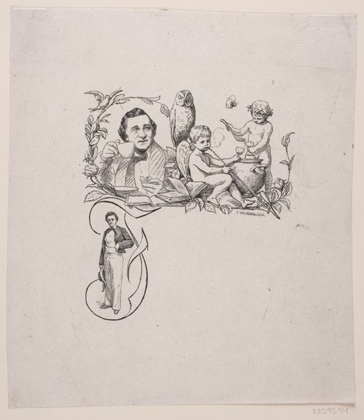 Editor: We are looking at "F.o. mand og kvinde bladrer i billedbog og f.n. to artister med vinger" by Nicolai Habbe, likely created sometime between 1827 and 1889. It appears to be a print, a lithograph in fact, and it’s quite striking with its contrast between the ordinary couple and the fantastical winged figures. What’s your take on it? Curator: It’s fascinating how Habbe positions this genre scene, this almost burlesque domestic tableau, against the backdrop of ethereal, winged figures. Consider the historical context: the 19th century saw the rise of the middle class and with it, a burgeoning market for satirical prints that commented on their lives, their aspirations, and perhaps their pretensions. Editor: So you see the winged figures as representing some kind of aspiration? Curator: Perhaps, or even a satirical jab. The placement suggests a commentary on the viewers themselves - are we looking at figures from their illustrated book? Are they angels, or the performers who were viewed as 'angels' by an adoring public? Habbe cleverly uses visual irony to expose the desires and fantasies of his audience. Consider how art like this played a role in shaping social norms. Did prints like this serve to elevate or to critique the ballet and those who loved them? Editor: It is interesting how this work makes you wonder about social classes. Looking at this piece made me wonder if it aimed to make fun of them. Thank you for sharing these perspectives with me. Curator: My pleasure. This piece offers a fascinating window into how art reflects and shapes societal values. We are looking at the artist making fun of a topic, with a sense of dark humor.