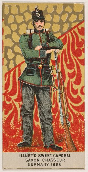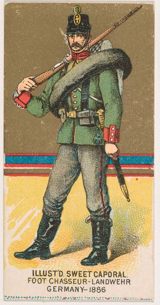 Curator: At the Met, we have "Bavarian Infantry, Germany, 1886" from the Military Series of N224, produced by Kinney Tobacco in 1888 to advertise Sweet Caporal Cigarettes. It's a lithograph print. Editor: It’s surprisingly charming! There’s a softness in the shading that undercuts any sense of military severity, and the somewhat pastel palette adds a whimsical, almost cartoonish feel. Curator: It is striking how these were conceived as advertising. Cigarette cards offered a collectible incentive. Military themes, particularly romanticized versions of European armies, were fashionable and spoke to broader imperialistic ideals of the time. Editor: The composition is intriguing. The soldier is centrally placed, rigidly posed, with the rifle mirroring his verticality. But the concentric golden semi-circles disrupt that strict formality—like a halo almost. Curator: The cards reflect the rising tide of nationalism across Europe and beyond. Displaying the ‘glory’ of these nations' forces was excellent marketing for Kinney. This romanticism obscured the grim realities of military life. Editor: What I find remarkable is the simplification of form. It’s graphic, certainly, yet there’s a considered reduction to essential shapes and textures that creates a clear, immediately readable image, perfect for a small card. Curator: Absolutely, this piece represents the cultural landscape where military prowess was elevated and used for mass consumption through commercial channels like tobacco companies. Editor: Indeed, examining it reminds us that even the seemingly innocent images of popular culture can embody loaded concepts. The formal elements highlight these cultural messages rather than simply relaying information.