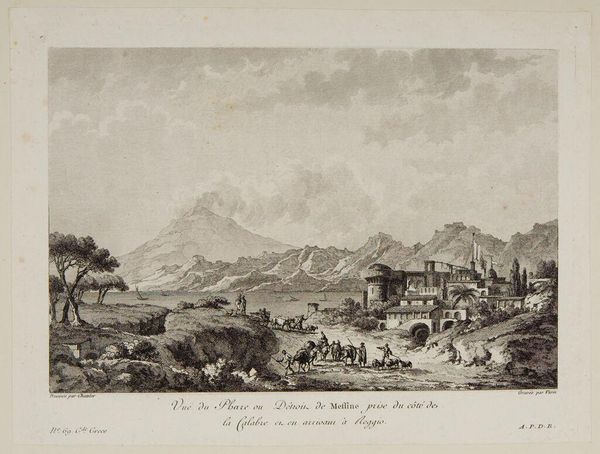 Curator: Joseph Varin's "View of the Gulf of Squilace and the Ruins of the Antique Scylatium" presents a scene steeped in historical weight. What strikes you most about it? Editor: Well, it's an interesting print. It kind of looks like people are dismantling the ruins, or maybe reusing the stones? What can you tell me about that? Curator: It’s crucial to consider the political context. Depictions of ancient ruins often coincided with periods of colonialism and resource extraction. How might this image participate in a visual discourse that legitimizes appropriation? Editor: So, it's not just a pretty picture of some old ruins, but maybe about power? I never would have thought of that. Curator: Exactly. And who are these figures laboring amongst the ruins? What does their presence, their potential lack of agency, tell us about the broader social dynamics at play? Editor: That makes you think about who benefits from the ruins, and who's just there to work. Curator: Precisely. It’s a reminder that landscapes are rarely neutral; they're often battlegrounds of competing interests. Editor: I see the print in a whole new way now.