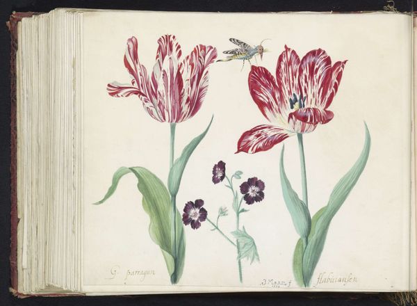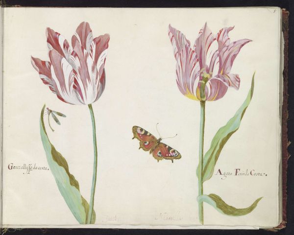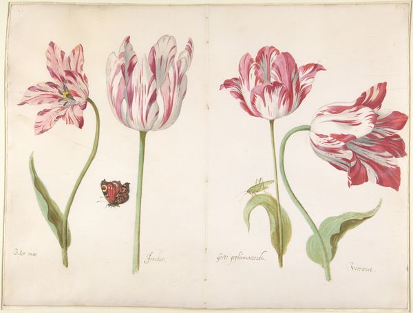 Curator: Here we have a rather captivating botanical drawing in graphite, chalk and watercolour from the Städel Museum's collection. It’s entitled “Iris mit Wolfsmilchschwärmer, Tulpe mit Schwalbenschwanz, Anemone.” Editor: It has a strikingly calm, almost scientific air about it. The way the individual plants are positioned centrally, set against that plain background, elevates them into something deserving of careful study. The colours are muted, soft, natural – as if to say: here they are in their quiet reality. Curator: Exactly. The artist seems intent on showing us the interplay between flora and fauna, an enchanted yet fleeting moment in nature. The juxtaposition between the moth and iris, butterfly and tulip, even the unfurling anemone, hints at the cyclical nature of life. What thoughts arise for you in connection to it? Editor: There's a beautiful balance between observation and a kind of Baroque flourish. It adheres, on one hand, to this notion of objectivity; on the other hand, that central tulip seems so opulent. The curves of the petals, the butterfly poised there so elegantly – they provide a hint of dramatic tension in the whole arrangement. Curator: True. The tulip in particular serves as a subtle reminder of the Dutch Golden Age’s “tulip mania,” evoking notions of prosperity, fleeting beauty and perhaps even fragility. One almost senses an attempt to capture time itself, to freeze these transient interactions for posterity. Editor: Yes. The use of watercolor seems key here. It renders the colors delicate and somewhat ephemeral. See how the light glances off the butterfly's wings, or even just the subtle gradations on the tulip leaf. It creates a feeling of immediacy; a glimpse of life captured at its most vibrant but also most transient. Curator: The piece certainly encourages contemplation about life's inherent impermanence. Its gentle precision underscores the constant negotiation between nature and existence itself. Editor: Agreed. Its structure reminds me of how beauty can be found when stillness permeates observations.